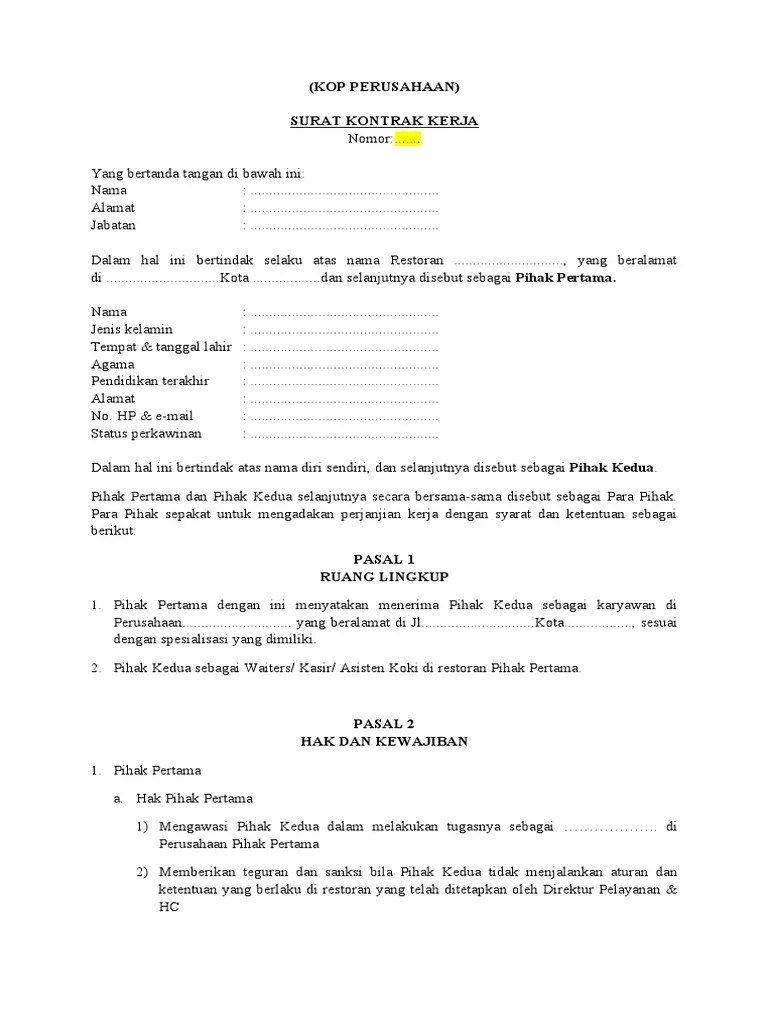 Yang bertanda tangan di bawah ini: surat kontrak kerja karyawan. Contoh kontrak kerja karyawan restoran.