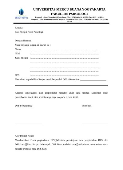 Pengurusan pindah kuliah tidak dapat diwakilkan. Mahasiswa mengambil dan mengisi formulir permohonan pindah kuliah . Mahasiswa mengambil dan mengisi formulir permohonan pindah program . Bermaksud mengajukan permohonan pindah kuliah dari universitas muhammadiyah. Demikian surat permohonan ini disampaikan, atas perhatiannya kami ucapkan .